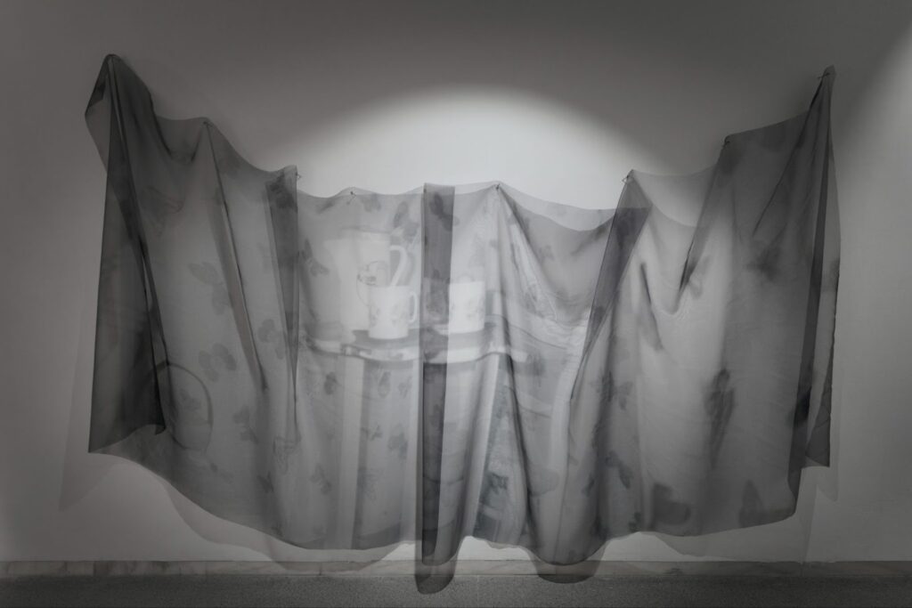 Amb la seva part d’instal·lació, l’exposició s’endinsa en una atmosfera de presències suspeses. “Hi ha molt d’aquesta idea fantasmagòrica”, destaca l’artista, i aquest halo es torna tangible en Espectre I i Espectre II: teles translúcides amb impressions de fragments de la casa de nines de la seva mare. En aquest cas, la transparència, més que revelar, reté en els seus plecs la calidesa domèstica de les infàncies esvaïdes.